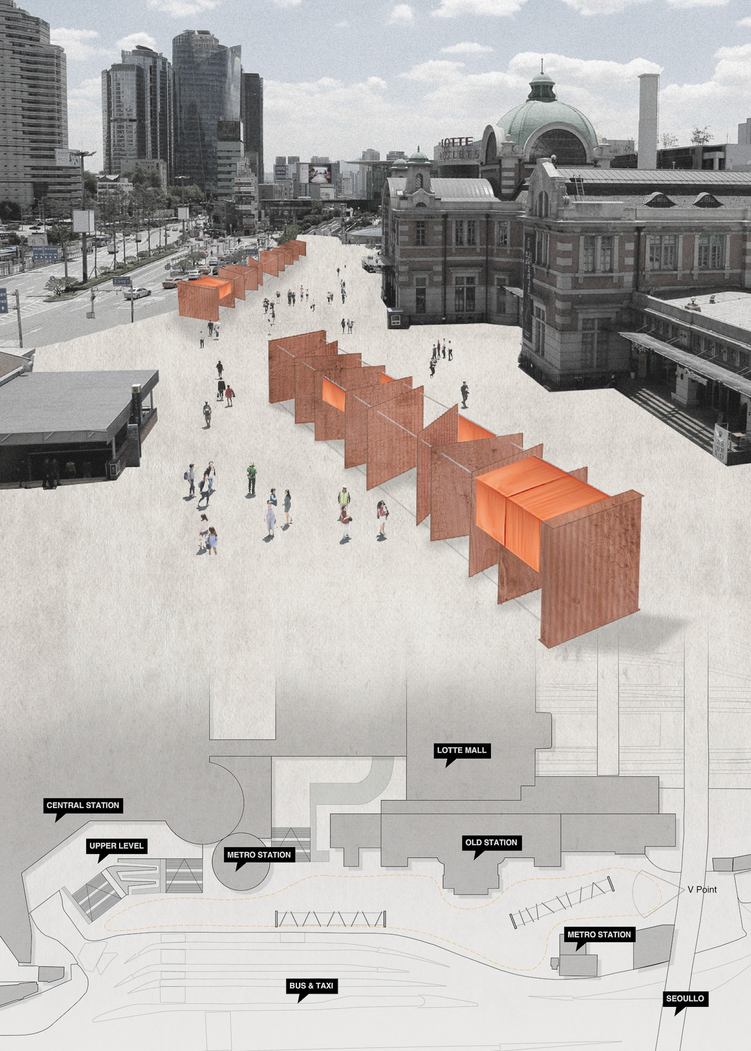 The area next to Seoul Central Station is one of the few important open spaces that sees the hybrid use of the space from the homeless and the tourists/commuters.