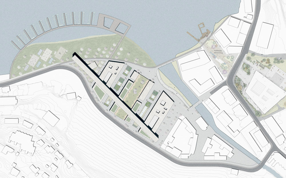 This competition required a large housing complex design in an area just on the outskirts of downtown Bergen. This district is witnessing an important urban redevelopment to advance the densification process already underway. The concept of sharing and co-housing was studied in order to develop a design that could contribute to the creation of a more just city.